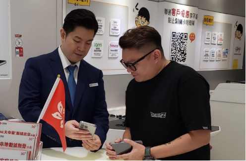 中國聯(lián)通香港營業(yè)廳客服人員為客戶介紹聯(lián)通境外移動業(yè)務手機客戶端MyCUniq APP的使用方法