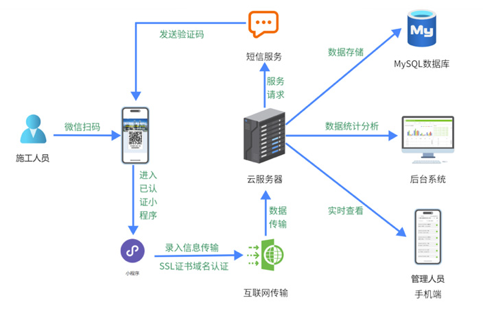 工人掃描二維碼進(jìn)行身份驗(yàn)證、上下班打卡,操作方便快捷。管理員在后臺系統(tǒng)中可查看數(shù)據(jù)統(tǒng)計分析,避免人工登記的不準(zhǔn)確性和信息延遲等缺點(diǎn)。