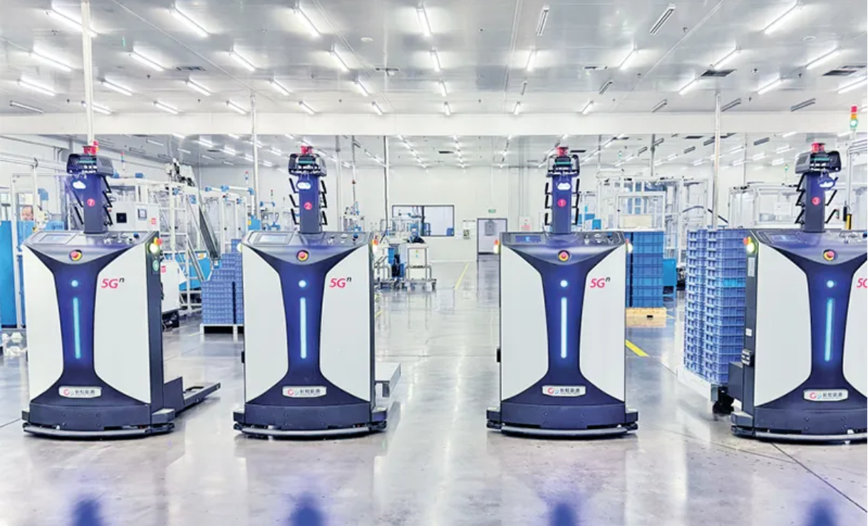 2023—2024年,中國聯通助力長虹新能源工廠引入“5G+”技術,在車間成功實施了人工智能(AI)自動化質檢和自動導引車(AGV)智能物流。圖為2024年4月18日拍攝的長虹新能源5G示范工廠內AGV智能物流小車。中國聯通供圖