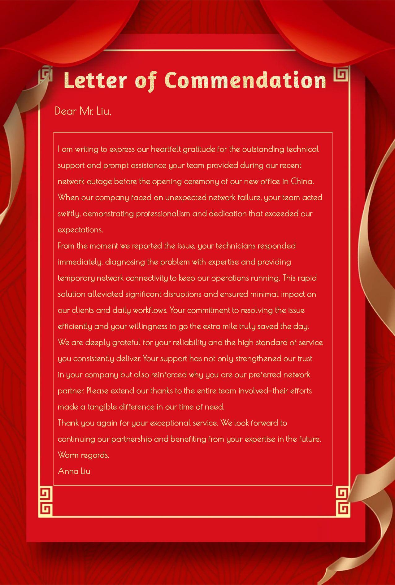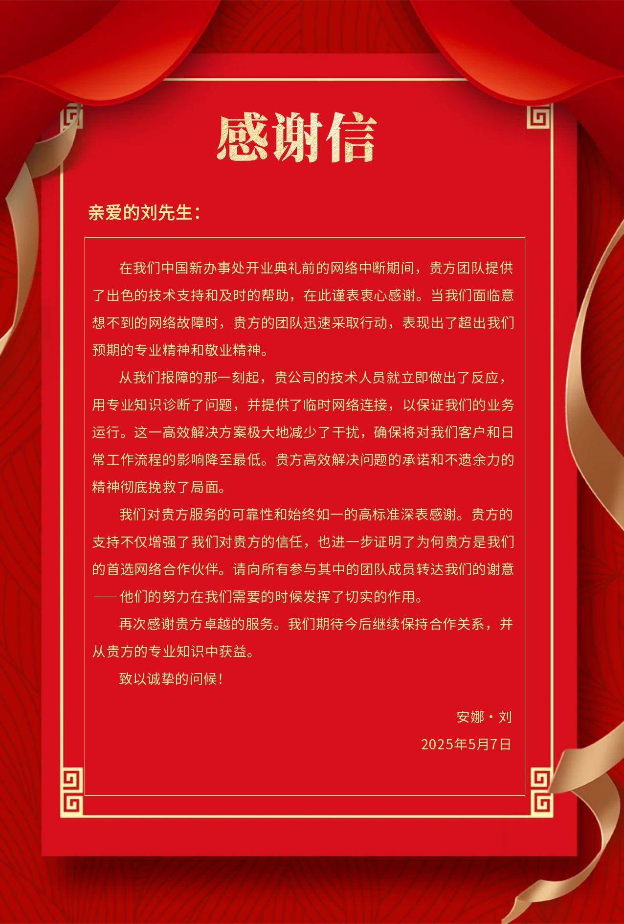 這是時代網(wǎng)星在今年收到的第三封客戶感謝信,這一封封感謝信不僅是對我們專業(yè)、高效服務的肯定,更是我們不斷前進的動力。未來,時代網(wǎng)星將持續(xù)以“服務為先,客戶第一”的服務理念,為每一位合作伙伴提供貼心、高效的網(wǎng)絡專家 & IT管家服務!
