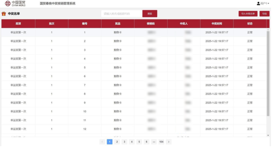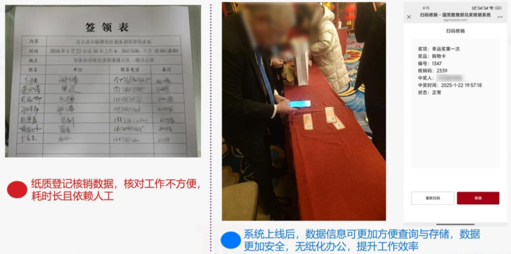 通過國貿(mào)工會(huì)春晚中獎(jiǎng)核銷管理系統(tǒng)的應(yīng)用,中獎(jiǎng)數(shù)據(jù)、人員信息及兌獎(jiǎng)情況等實(shí)現(xiàn)了系統(tǒng)化管理,數(shù)據(jù)查詢與存儲(chǔ)更加便捷高效,數(shù)據(jù)安全性得到全方位保障。全新的二維碼核銷兌獎(jiǎng)方式,不僅簡化了流程,更釋放了大量人力資源,推動(dòng)國貿(mào)工會(huì)數(shù)字化辦公水平邁向新臺(tái)階。
