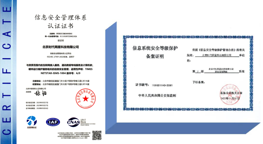 繼5月獲得信息安全管理體系認證后,近日,時代網(wǎng)星數(shù)據(jù)中心正式通過信息系統(tǒng)安全等級保護二級備案認證,標志著在數(shù)據(jù)安全防護、系統(tǒng)穩(wěn)定運行等核心領域已邁入高標準、規(guī)范化發(fā)展行列,為自身業(yè)務持續(xù)發(fā)展與客戶服務質(zhì)量提升筑牢了堅實的網(wǎng)絡安全防線。